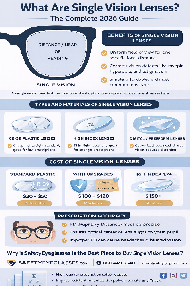 The single vision lenses price guide will be useful when planning a purchase of new eyewear. Optical industry prices differ depending on the lens material, the brand, and any other protective coatings. The most affordable point of entry is standard plastic lenses. However, high-index materials, specialized safety polymers, or advanced digital surfacing will naturally cost more. In 2026, the lens type single vision market is highly competitive, and there are numerous levels of pricing.